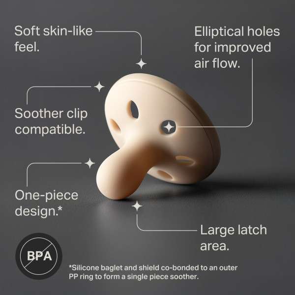 • Breast-like one-piece design**: This soother has a soft, skin-like feel, a large latch area, and a symmetrical teat that lets baby’s tongue comfortably elevate and cup, just like it does when breastfeeding