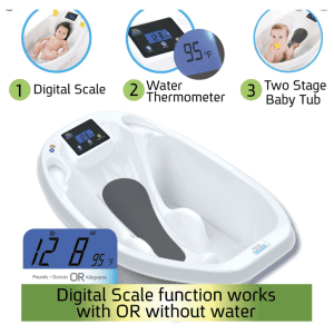 Number 1: a digital scale: put the tub on a flat platform or on its own stand, press on, fill the tub with water, press the “zero scale” and wait 2 seconds for calibration. Lie the baby on the tub and the exact weight will appear! The digital scale can work with or withouth the water