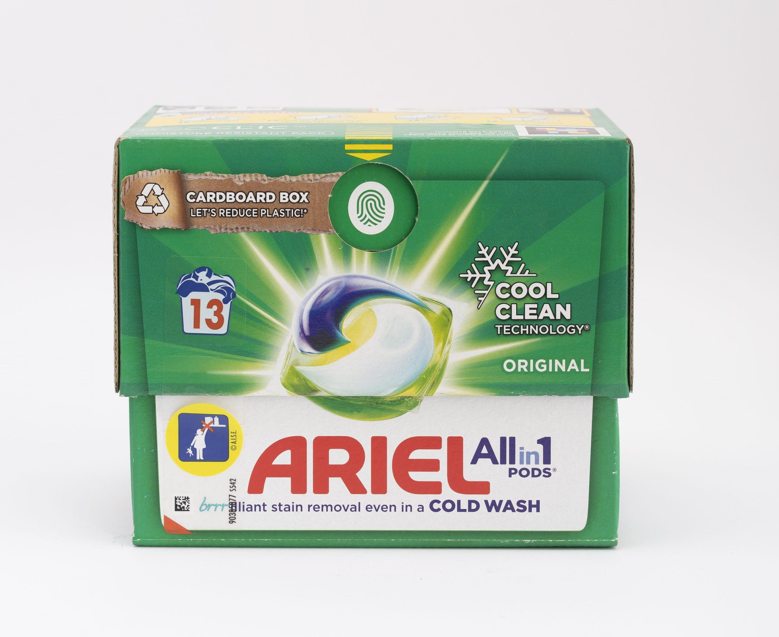 Ariel All-in-1 PODS® washing capsules laundry detergent Original provide brilliant stain removal even in a cold wash. They have been designed for cold, with unique technologies like COOL CLEAN Technology. Wash colder with Ariel All-in-1 PODS®: save energy in every wash and reduce your laundry’s COâ‚‚ emissions. On top, Ariel Original washing tablets can now help reduce plastic thanks to their recyclable ECOCLIC cardboard box. It contains recycled cardboard with maximum 5% plastic, designed to preserve your PODS®. Upon contact with water, their 100% water-soluble PODS® film fully dissolves, even in cold, to release powerful stain-removing technologies, offering Ariel’s deepest and strongest All-in-1 PODS® Original clean ever. Ariel washing capsules contain 80% of biodegradable ingredients and are also produced with 100% purchased renewable electricity. WARNING: this product may be harmful and could cause serious injury. Always keep Ariel All-in-1 PODS® washing capsules laundry detergent out of reach of children. Visit keepcapsfromkids.eu for more information.