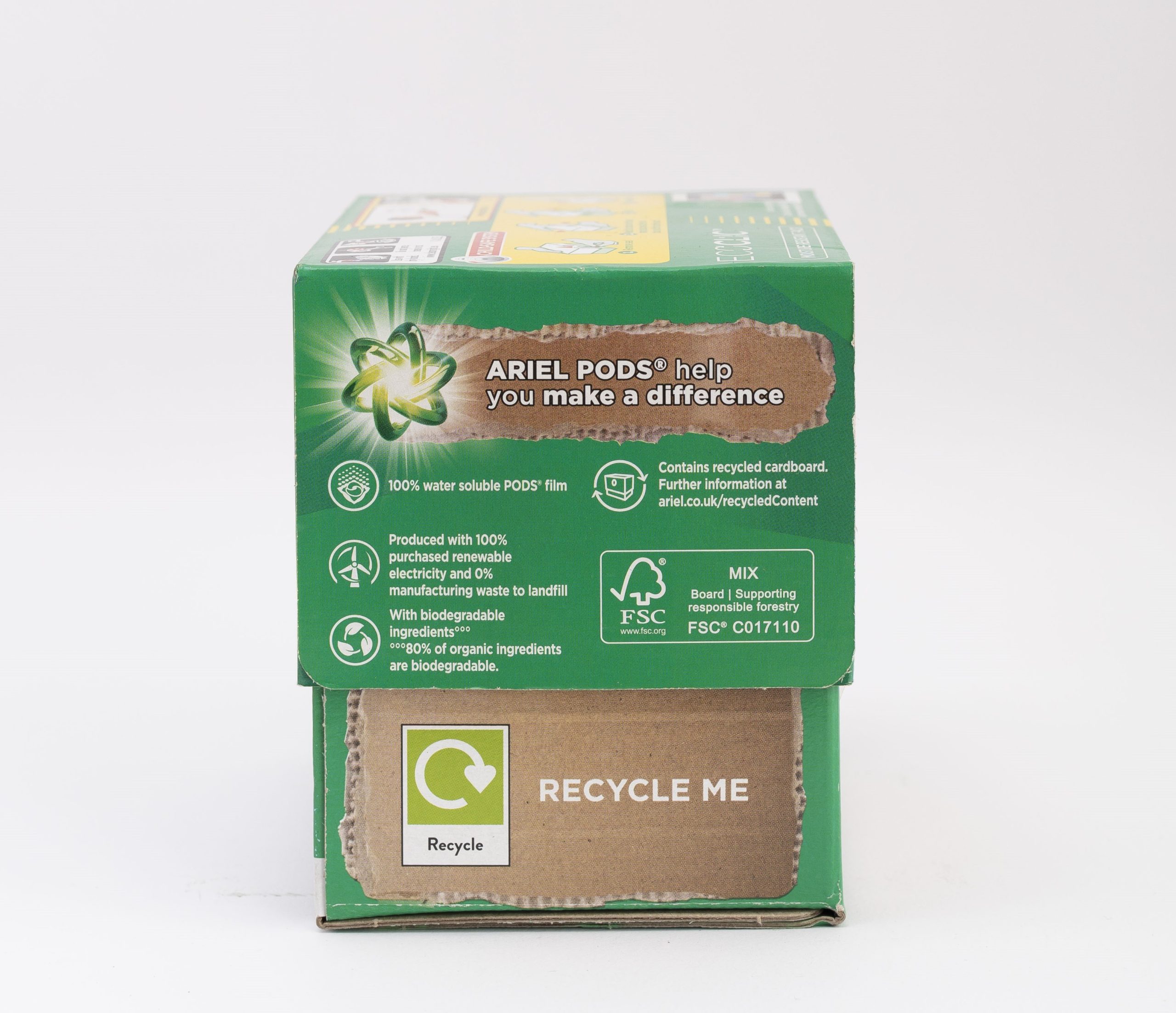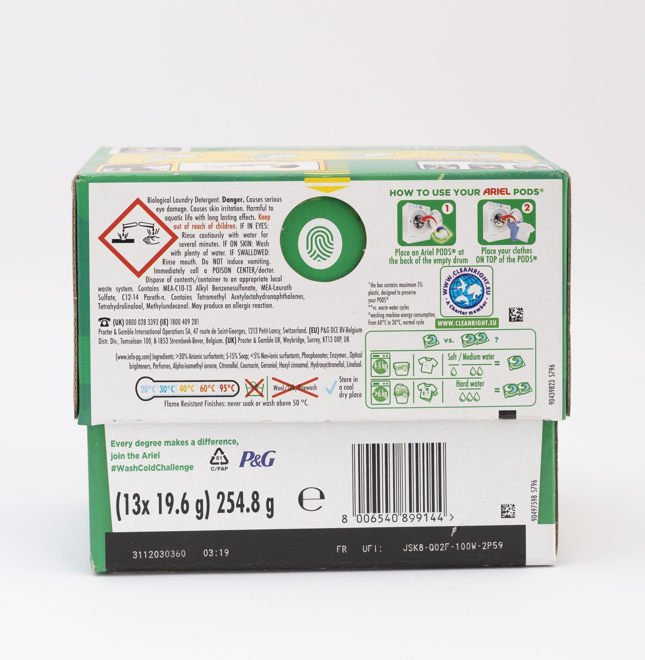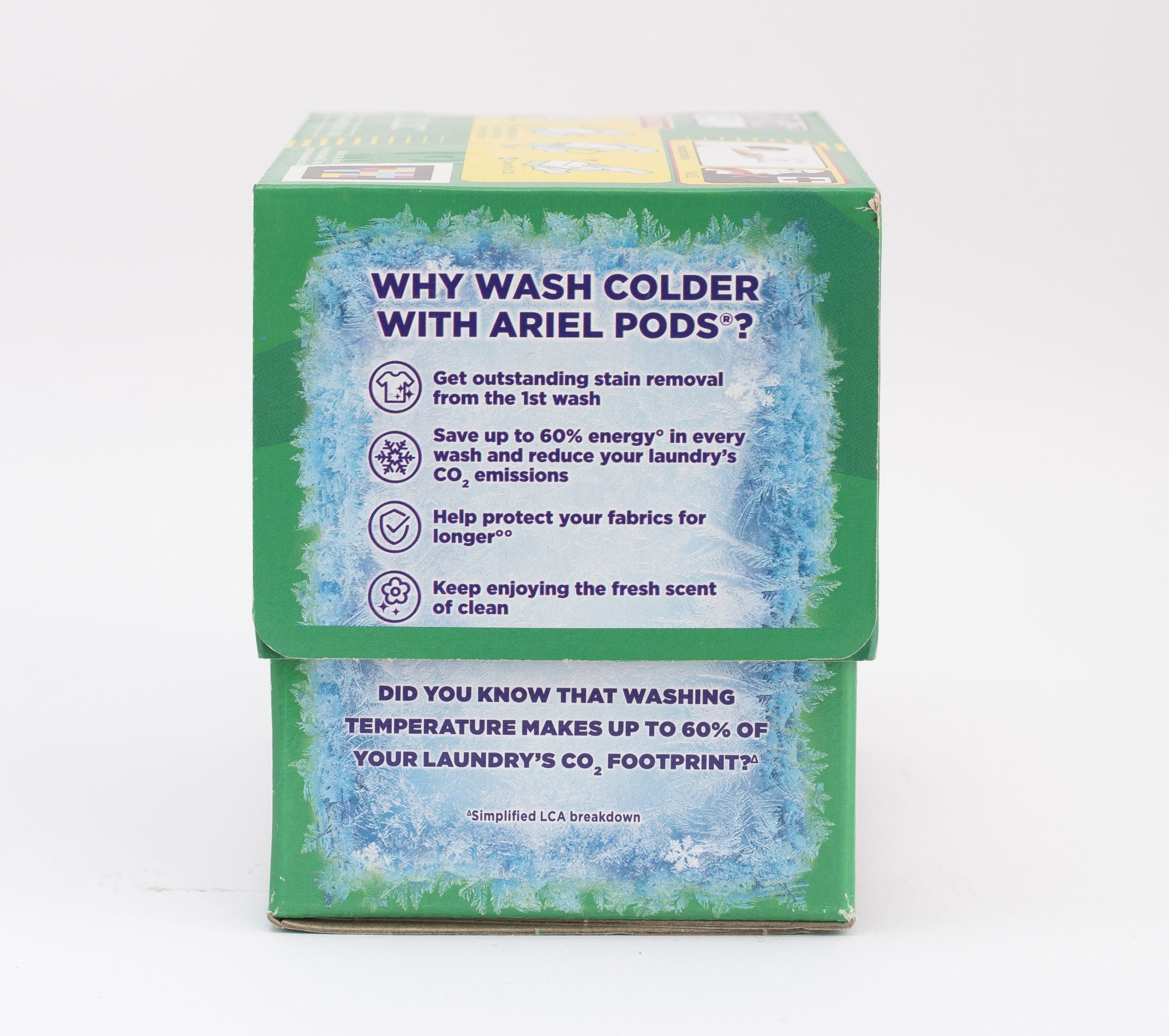 BRRRILLIANT STAIN REMOVAL: Ariel All-in-1 PODS® washing capsules deliver brrrilliant stain removal, even in a COLD WASHDESIGNED FOR COLD: Ariel All-in-1 PODS® washing capsules now come with unique COOL CLEAN Technology WASH COLDER WITH ARIEL ALL-IN-1 PODS®: Save energy in every wash and reduce your laundry’s COâ‚‚ emissions ECOCLIC CARDBOARD BOX: Let’s reduce plastic with Ariel All-in-1 PODS® washing tablets now coming in a recyclable cardboard box, contains recycled cardboard with maximum 5% plastic, designed to preserve your PODS®100% WATER-SOLUBLE PODS® FILM: Ariel laundry detergent PODS® have a 100% water-soluble PODS® film, even in cold WITH BIODEGRADABLE INGREDIENTS: 80% of organic ingredients of Ariel PODS® are biodegradable MADE WITH 100% PURCHASED RENEWABLE ELECTRICITY: Ariel washing capsules are produced with 100% purchased renewable electricityGREAT FOR CLEANING, NOT FOR LITTLE HANDS: Always keep Ariel All-in-1 PODS® out of reach of children. Visit keep caps from kids.eu for more information
