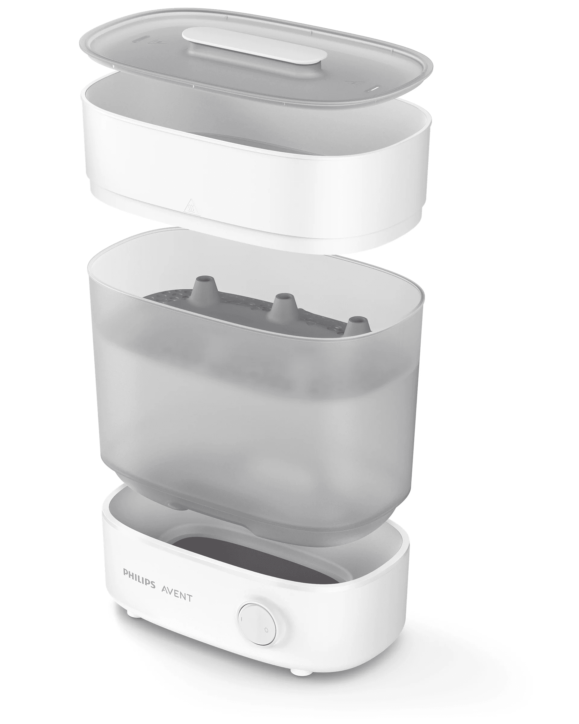Our sterilizer is slender and yet still holds up to six Philips Avent baby bottles. It also fits all the other essentials, from teats and soothers to a manual breast pump.