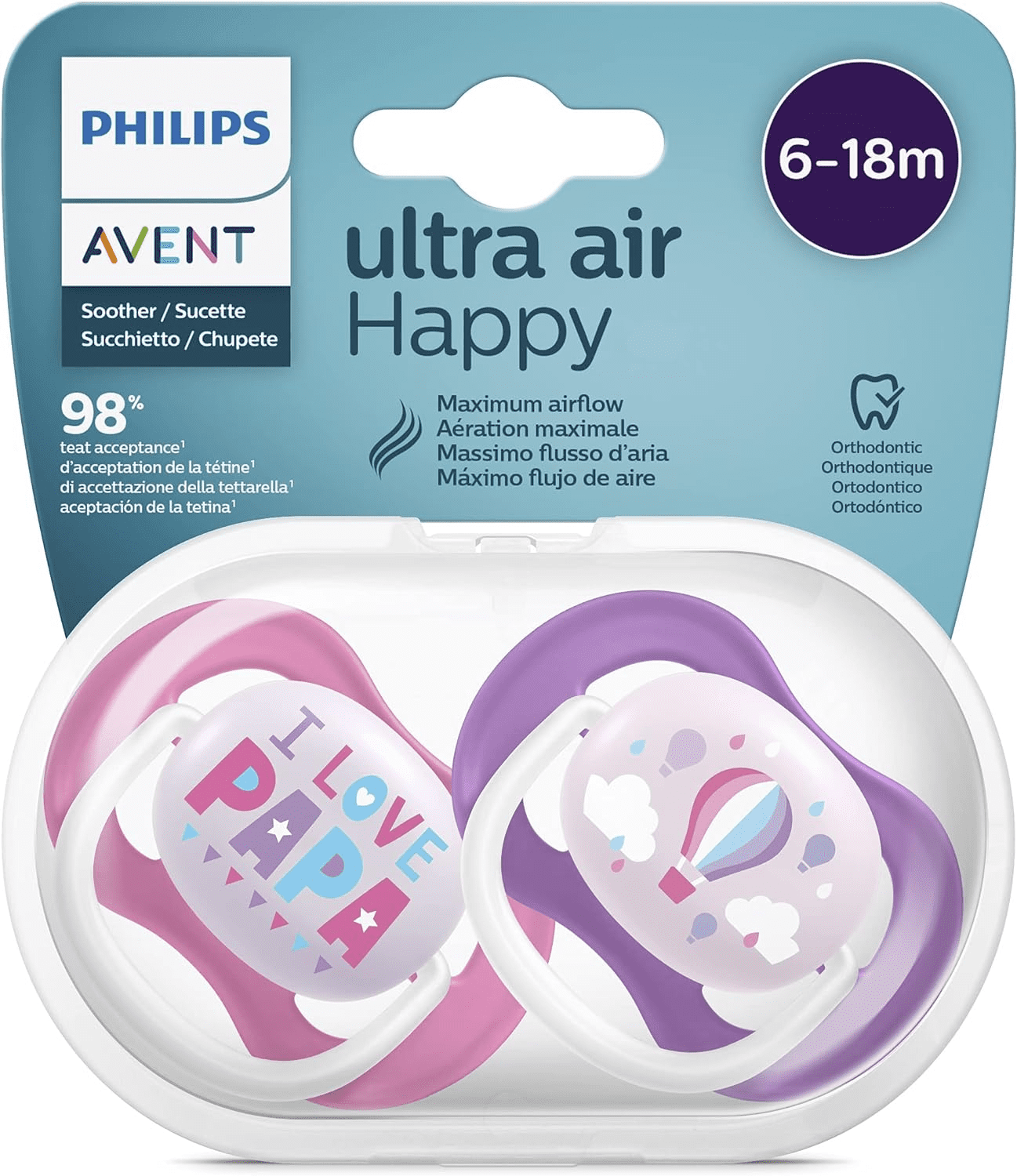 *2016-2017 US consumer tests show an average of 98% nipple acceptance of the textured Philips Avent nipple used in our 0-6m and 6-18m ultra air and ultra soft pacifiers.