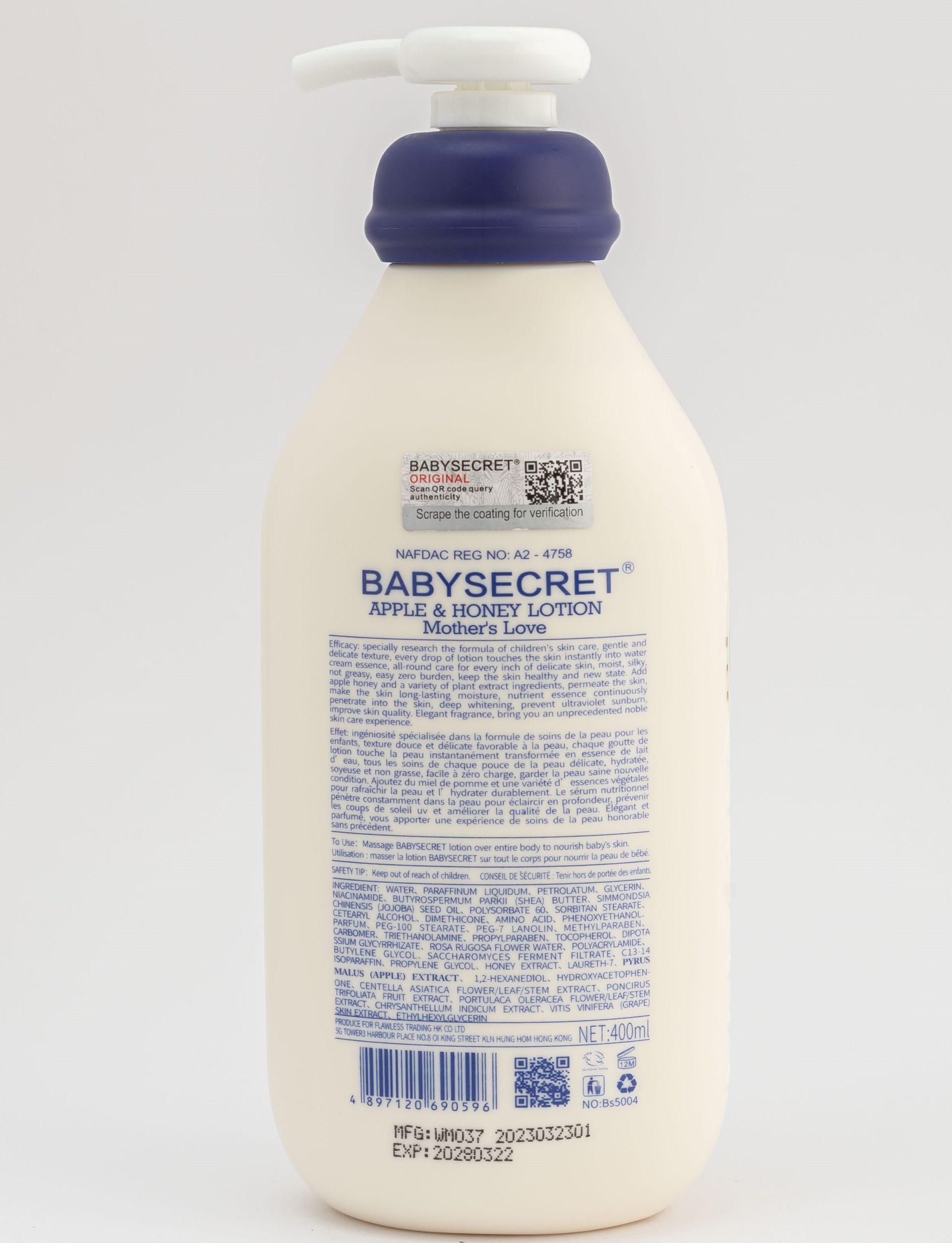 Baby Secret Moisturizing Lotion, serves as an effective replenishment for skin water loss. The lotion firmly locks water into place by forming a protective film on baby’s skin’s surface all day long.