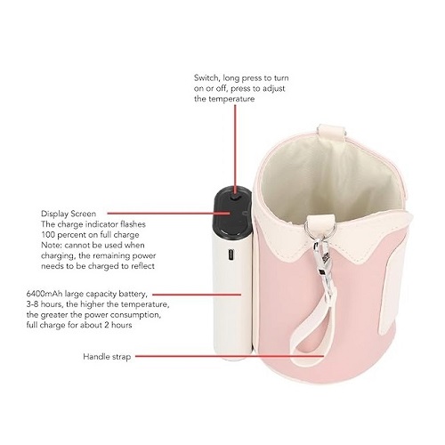 This bottle warmer bag is with 6400mAh large capacity battery, 3-8 hours battery life, the higher the temperature, the higher the power consumption, fully charged in about 2 hours, can not be used when charging.