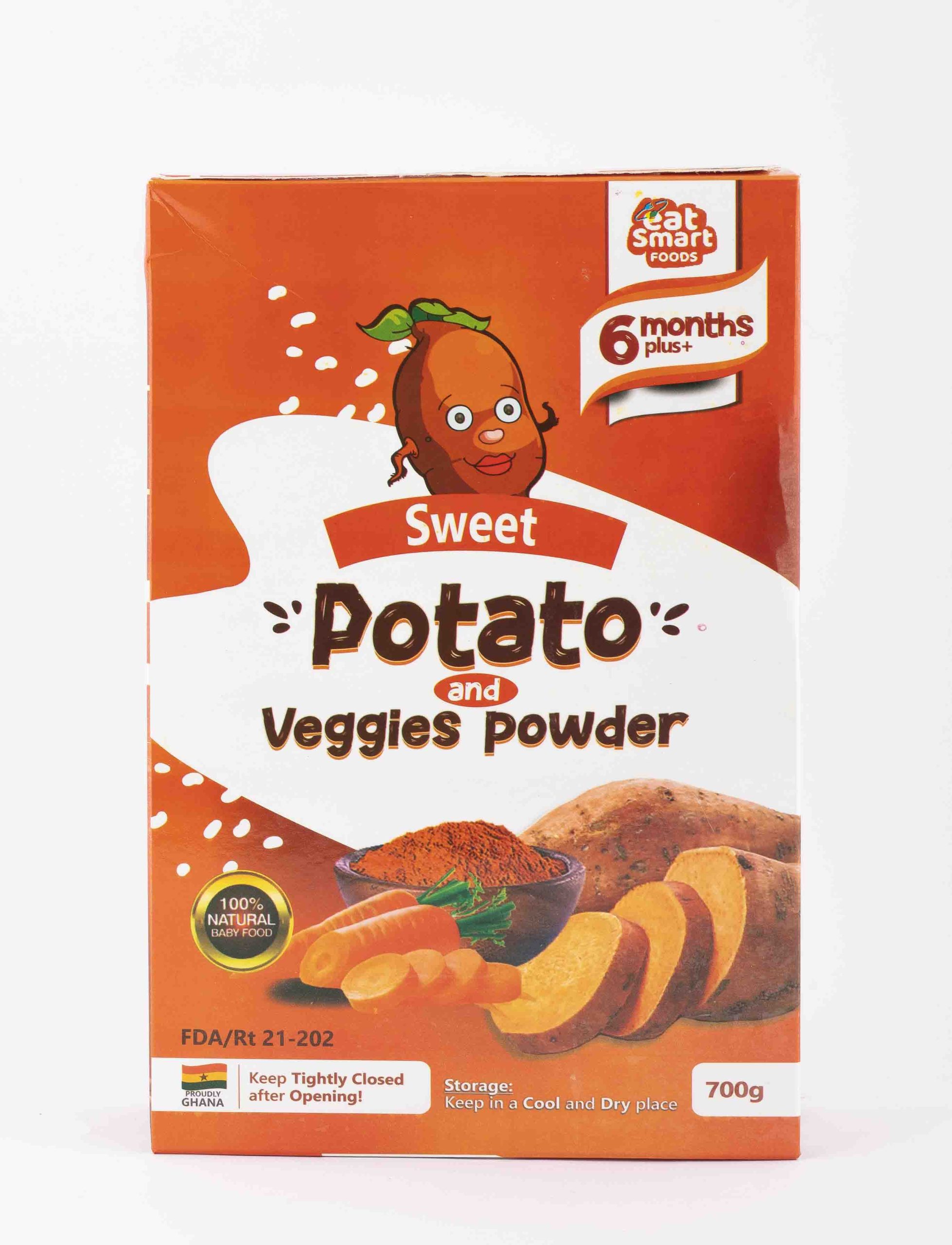 Eat Smart Foods Sweet Potatoes and Veggies powder is a rich combination of Orange Fleshed Sweet Potatoes with key essential ingredients.This product is formulated to ensure that children from the ages of 6m to the whole family get access to a daily portion of their vitamin A,proteins,fat,carbohydrates,Energy and other essential nutrients after enjoying its goodness.It is colorful,natural,tasty and gives you a smart boost for the day . It is great for porridges,smoothies,pancakes,banku,bakes ,pottage and many more .