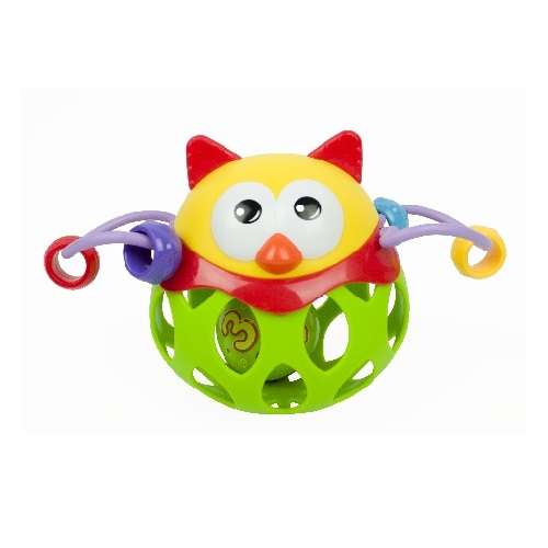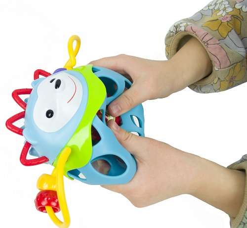 Baby can touch, rotate, and move the four colorful rings on the toy’s arms. This way, they learn to name colors and recognize a new shape, such as a circle . The toy has a flexible, rubber belly with an openwork design . Inside, there’s a colorful, rattling ball . It’s divided into two contrasting halves, one marked with the letters A, B, and C, while the other half is filled with the numbers 1, 2, and 3.