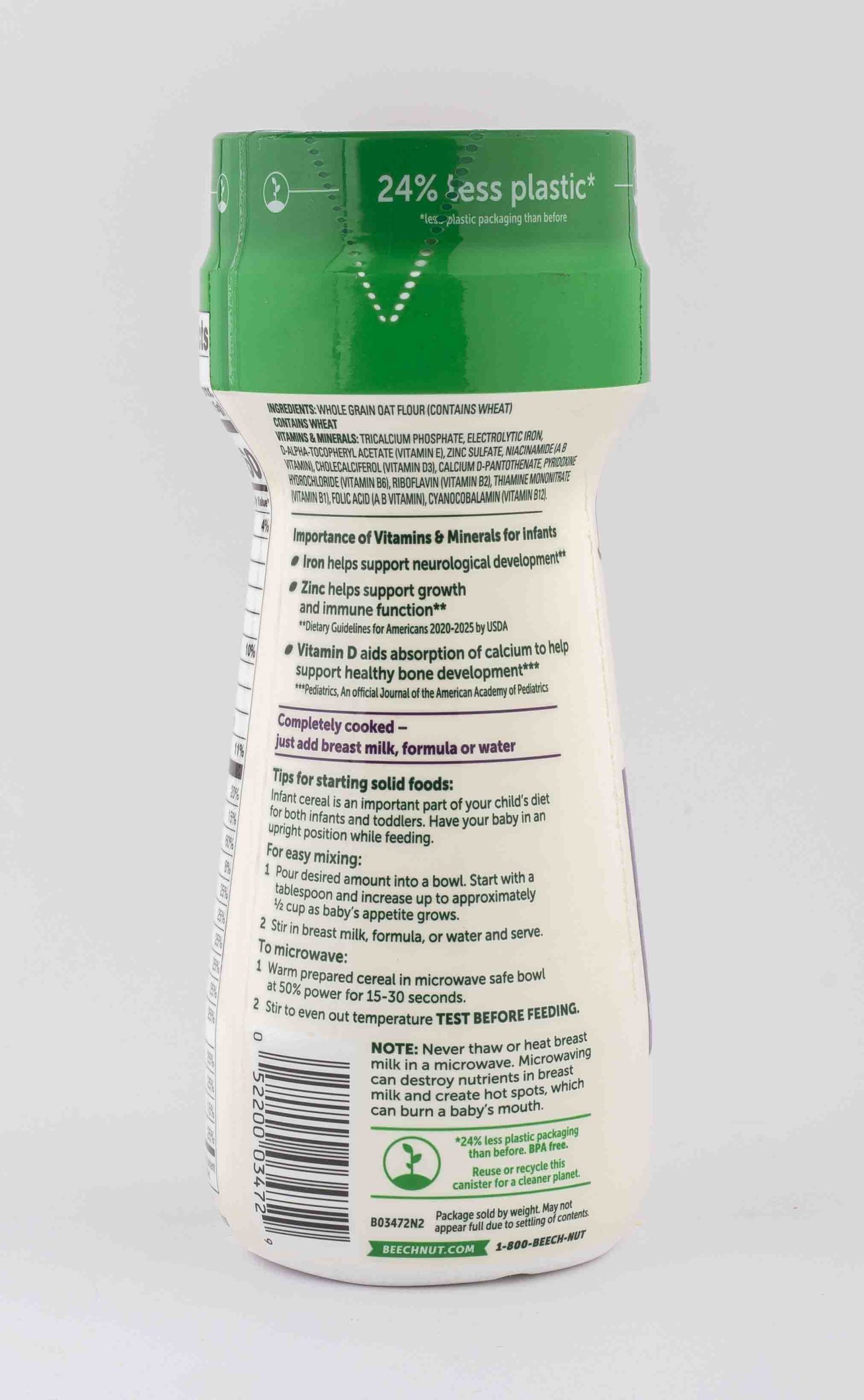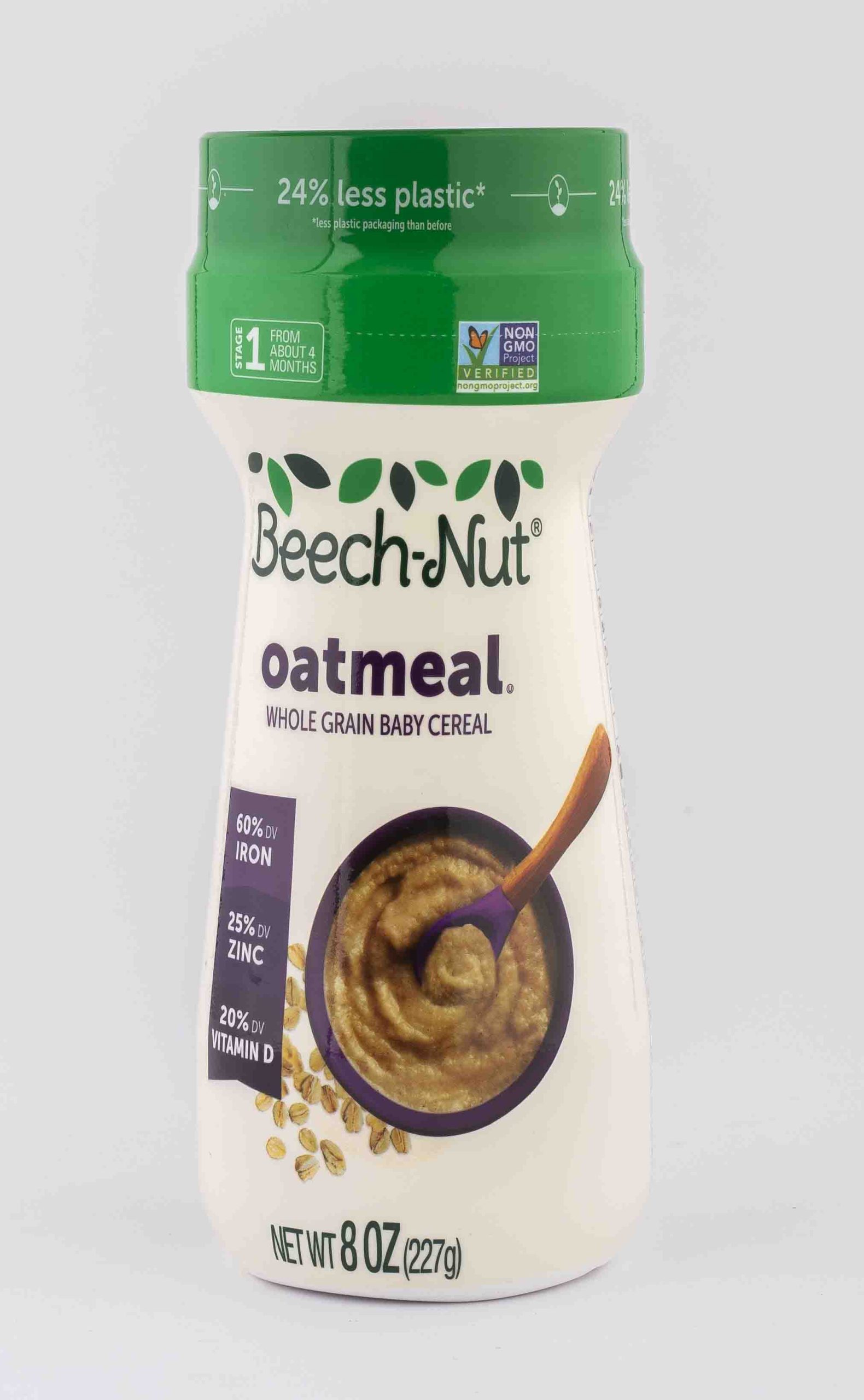 Beech-Nut Oatmeal Baby Cereal is a great first food for babies starting solids. It has a creamy, easy-to-digest texture and provides baby with 60% daily value of Iron, 25% daily value of Zinc and 20% daily value of Vitamin D. Mix our infant cereal with breast milk, formula, water, or Beech-Nut baby food puree to create a hearty cereal that will help keep baby full through the day. Beech-Nut Oatmeal Infant Cereal is made with non-GMO oats and no added sweeteners or salt. It’s also a great alternative to rice cereals. This Stage 1 baby cereal is ideal for babies 4 months and up.