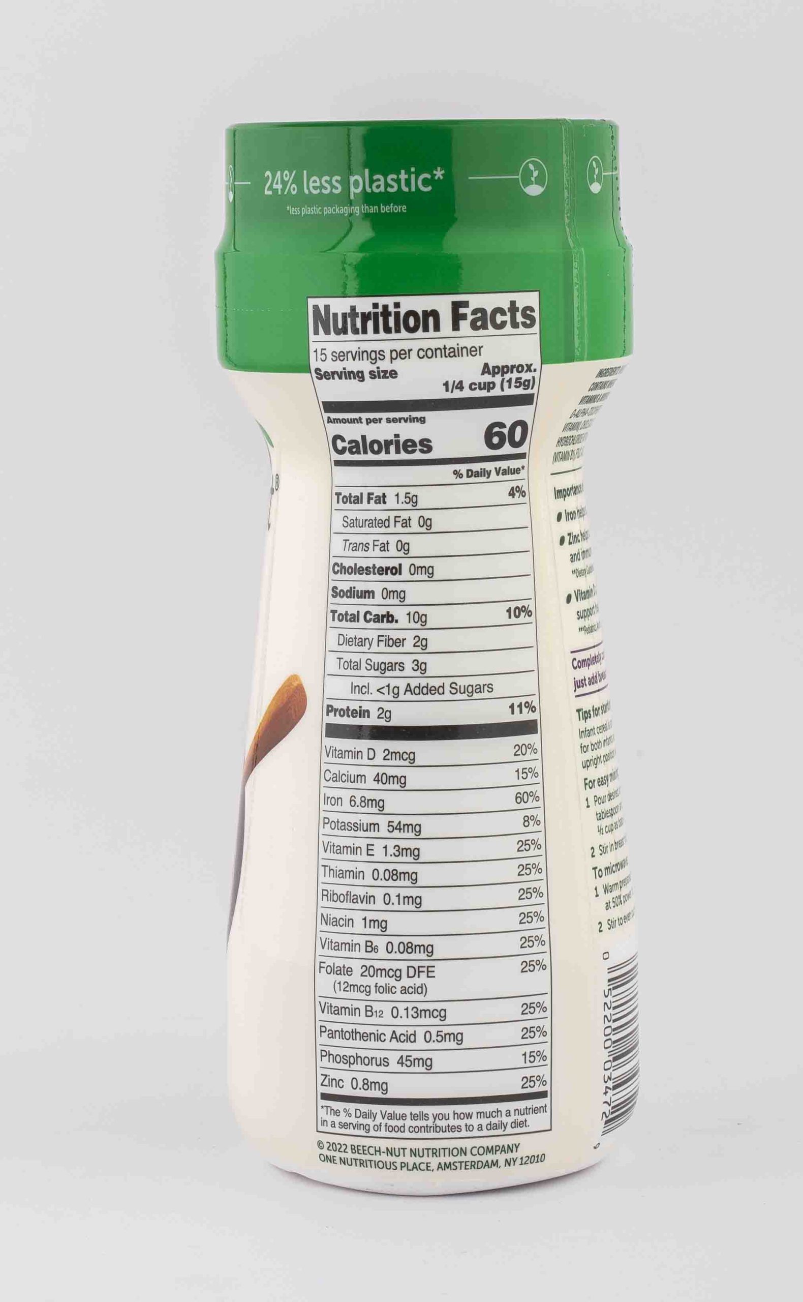 Beech-Nut Oatmeal Baby Cereal is a great first food for babies starting solids. It has a creamy, easy-to-digest texture and provides baby with 60% daily value of Iron, 25% daily value of Zinc and 20% daily value of Vitamin D. Mix our infant cereal with breast milk, formula, water, or Beech-Nut baby food puree to create a hearty cereal that will help keep baby full through the day.