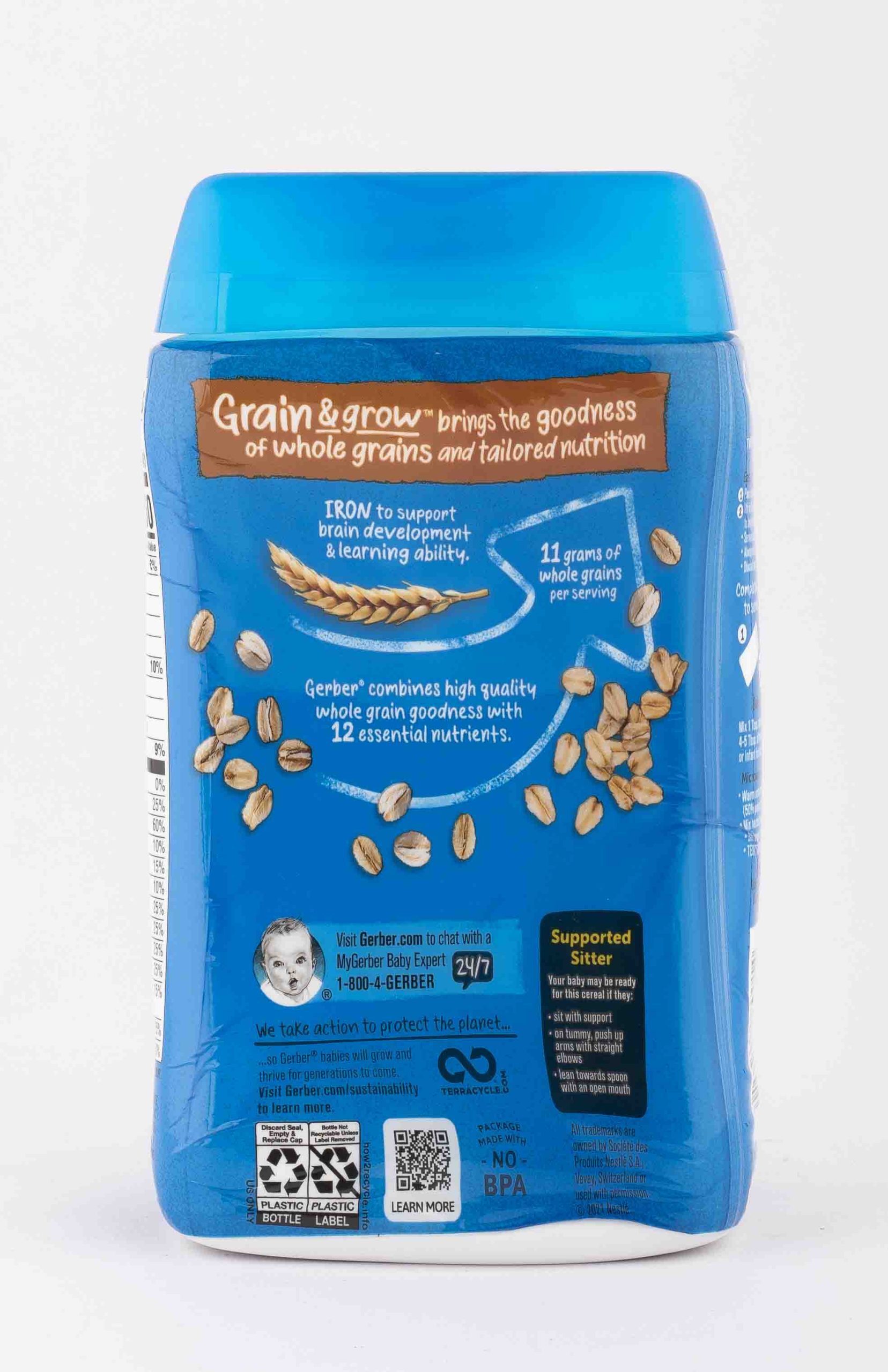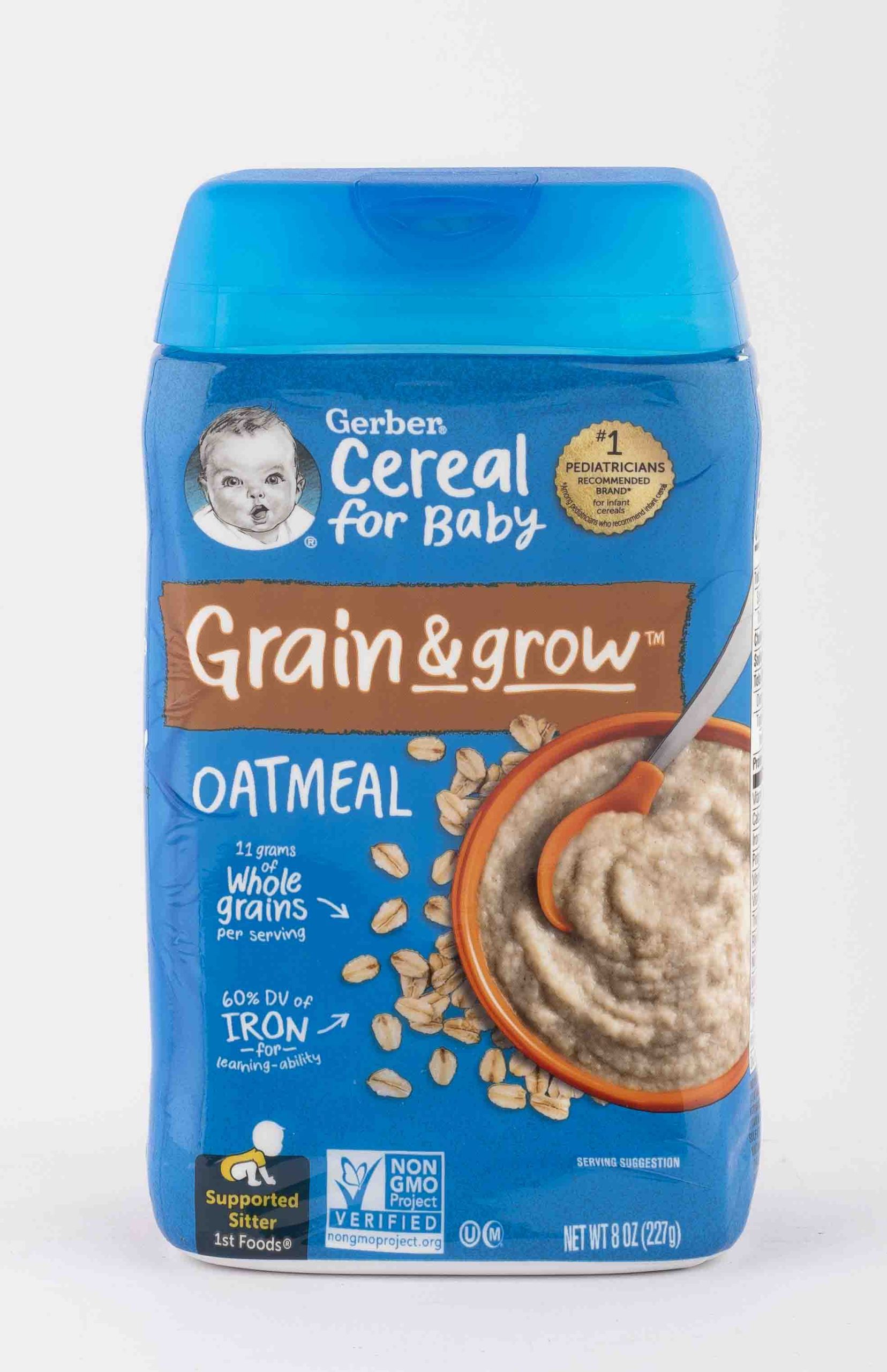 Gerber Single Grain Cereal: Oatmeal Gerber Oatmeal Cereal is baby’s number one food source for Iron,* available in an easy-to-use, less-mess package that’s easy to pour, scoop, open, and close. This completely cooked cereal is ready to serve – just add liquid. It provides baby with Iron, Zinc, Calcium, Vitamin C, Vitamin E, and six B Vitamins for healthy growth and development. Among the foods your baby eats, Gerber cereals are the number one source of Iron. Two servings (about ½ cup) offer 90% of your baby’s daily Iron needs Made with VitaBlocks Nutrient Blend With Iron, Zinc, Calcium, Vitamin C, Vitamin E, and six B Vitamins No added starch, artificial colors, or flavors NutriLock seal.