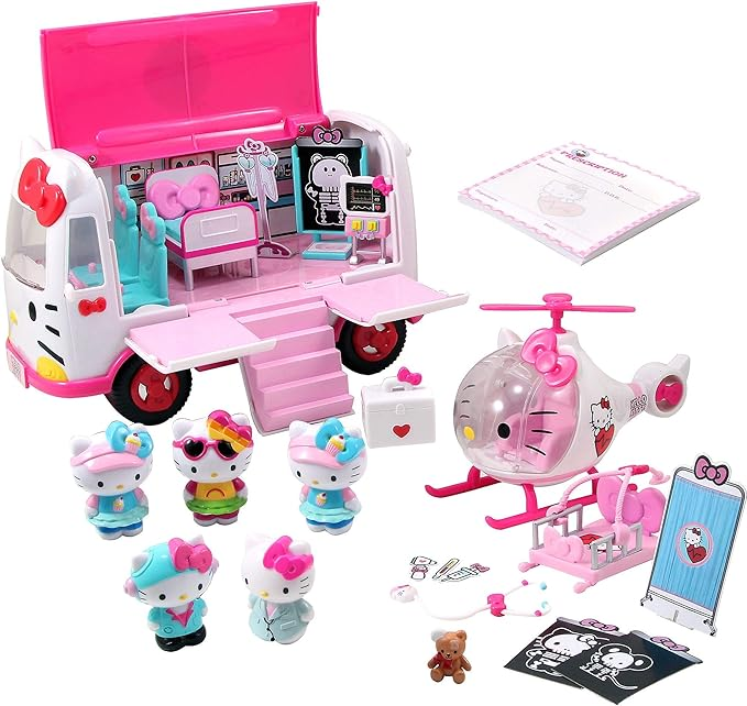 Hello Kitty has entered the medical field with this large play set that features an ambulance that converts into a fully functional emergency room. This set includes an emergency helicopter emergency ambulance 6 play figures stretcher cable hook Doctor case patient bed x-ray stand EKG machine stethoscope prescription pad plus and More. Ages 4+.