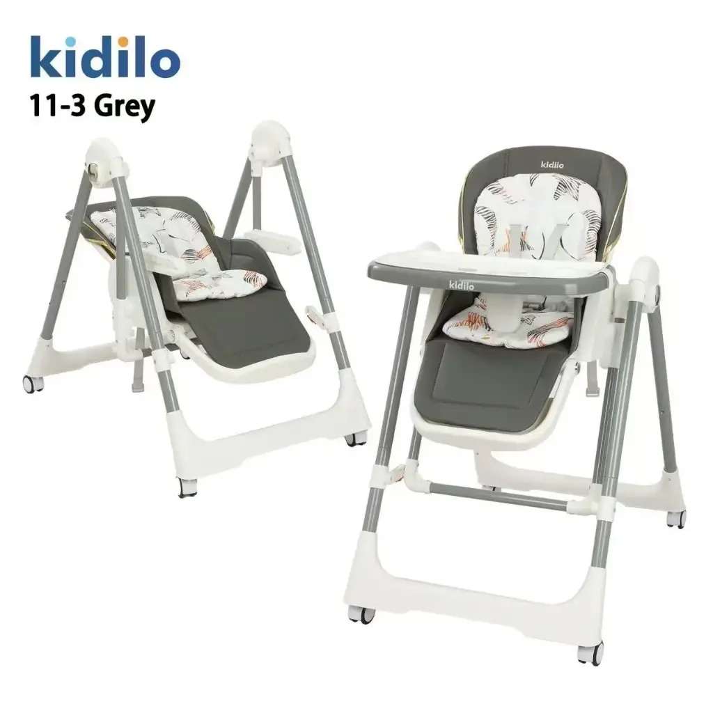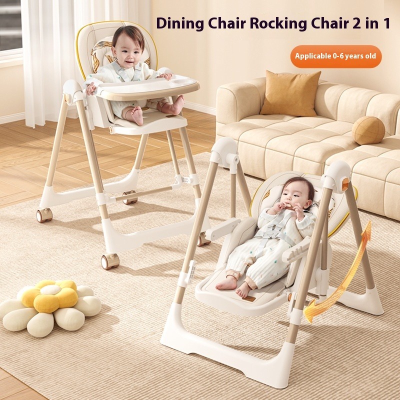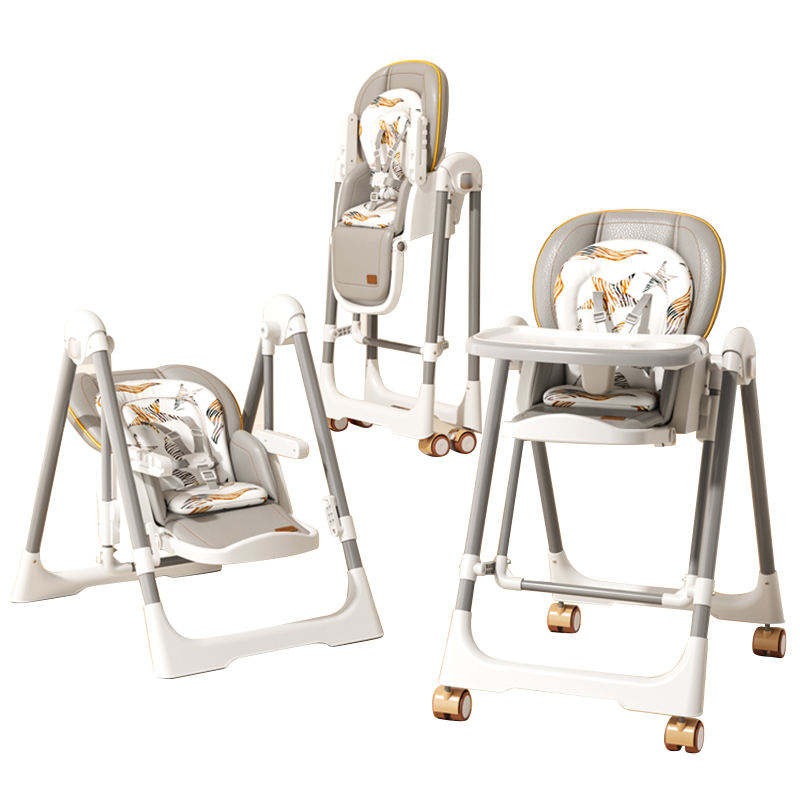 Made from durable plastic and metal, it features adjustable height, a compact foldable design, and smooth-rolling wheels for easy mobility. The sleek glossy finish adds elegance while ensuring practicality for dining and feeding.