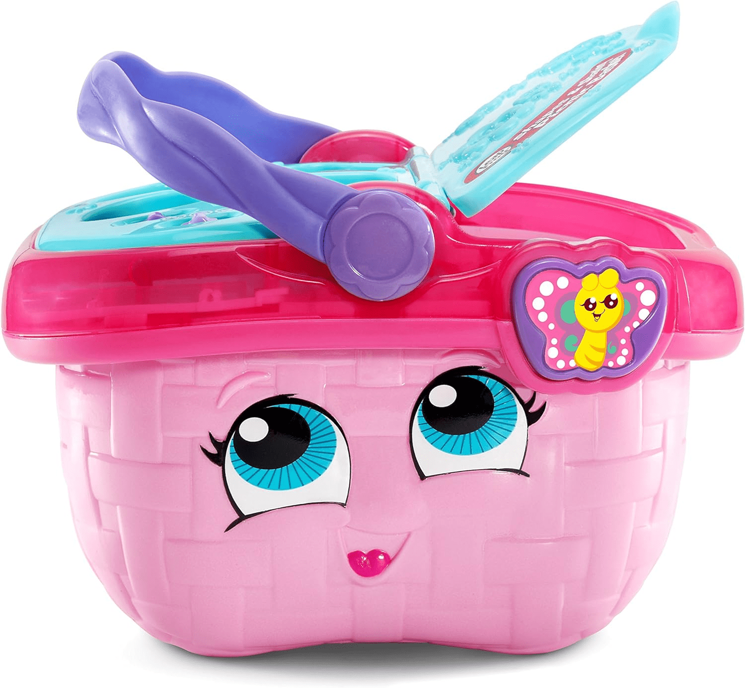 Learn about colors, shapes, manners and more while on a pretend picnic with the Shapes & Sharing Picnic Basket. Lift the lid to hear cheerful phrases and unpack the 15 play pieces, including colorful plates, forks, cups and food. The interactive shape sorter on the lid recognizes the food pieces and says the shape and color of each one. Hear polite food requests and delightful learning songs by pressing the butterfly button. Drop the correct food in the basket for rewarding responses that encourage good manners. Learning’s a picnic with this friendly basket!