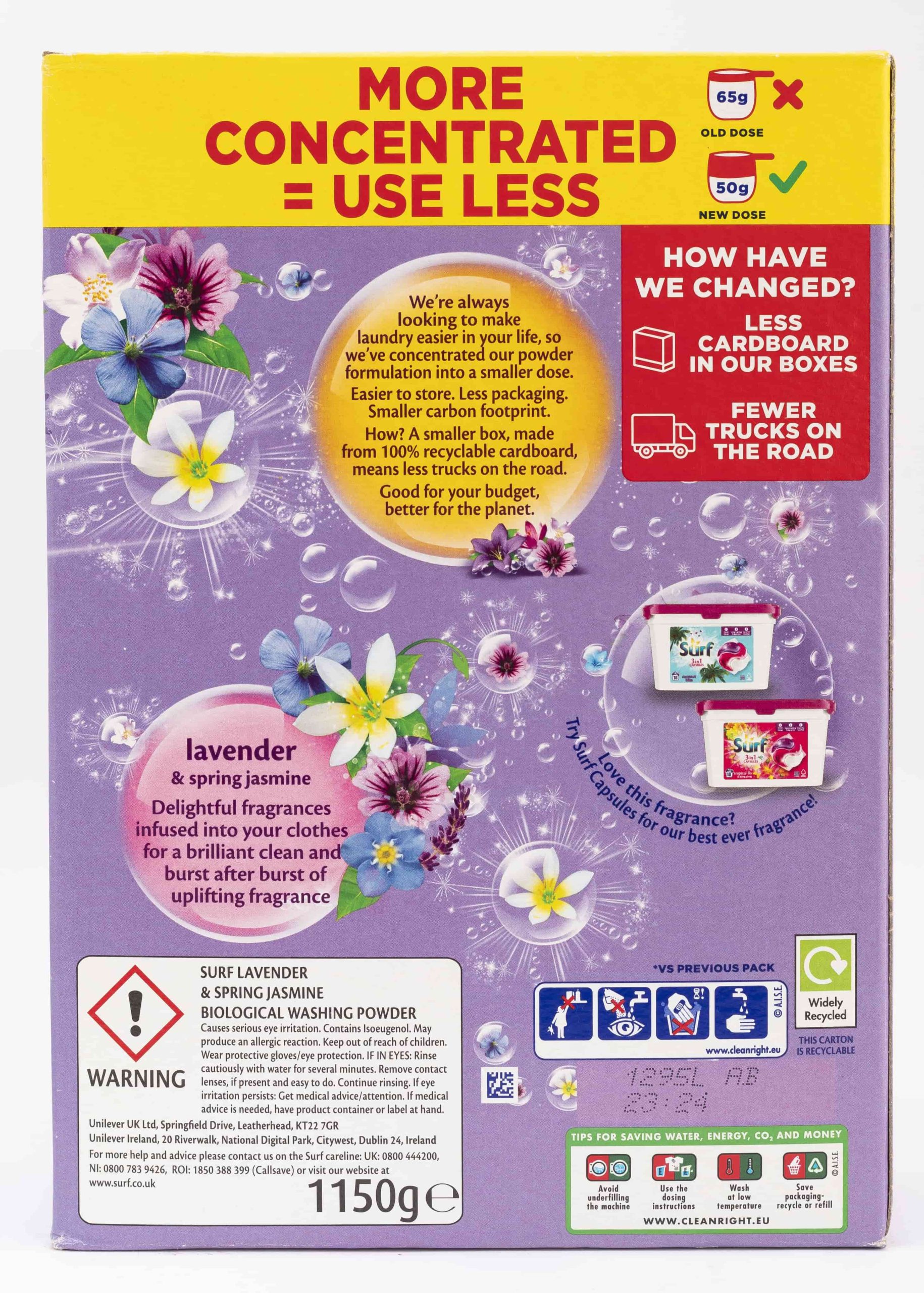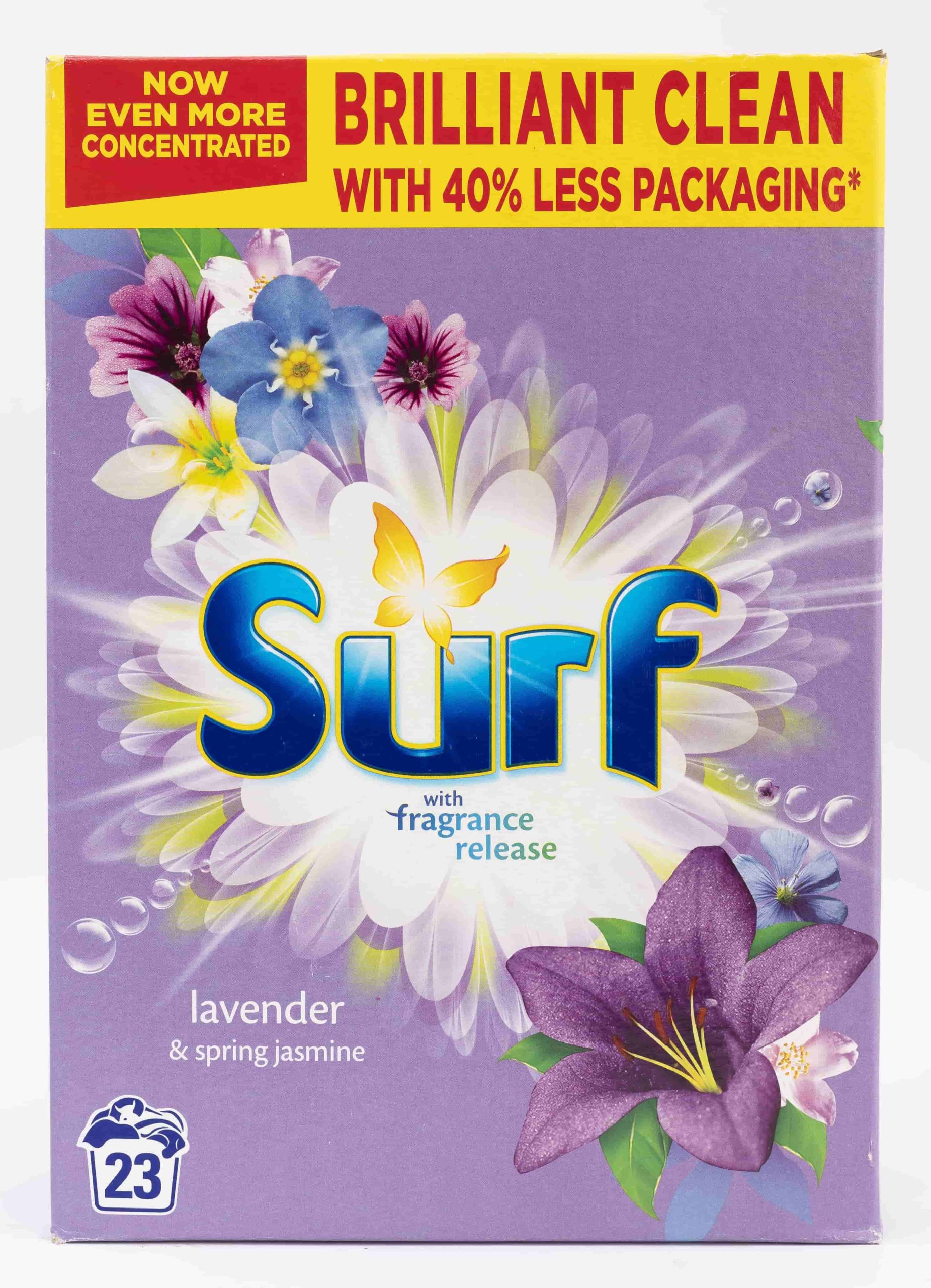 With natural essential oils, Surf Tropical Lily Laundry Powder lends your laundry the tropical aromas of exotic florals, natural woods and lush fruits.Fragrance release ensures this laundry powder gives your clothes an intense burst of freshness released throughout the day.This washing powder now uses 40% less packaging* – a smaller box, made from 100% recyclable cardboard, means fewer trucks on the road Washing powder from Surf, the UK’s no.1 fragrance powder detergent brand**If you love the fragrance of this laundry powder, try Surf capsules for our best ever fragrance.Surf concentrated laundry powder gives you brilliantly clean laundry every time while caring for the fabric in your clothes.Indulge your senses in fragrant bursts of exotic florals, natural wood and lush fruits with Surf Tropical Lily Laundry Powder. Its fragrance release formula ensures burst after burst of tropical scent released right through your day, so your laundry stays fragrantly fresh, with a brilliant deep clean you’ll love. Feminine and strong, the lily’s honeyed, floral scent is a favourite, ranking in the top five most popular fresh cut flowers in the world. You can rest assured that your clothes will be brilliantly clean and fresh for longer with this laundry detergent from the UK’s no.1 fragrance powder detergent brand**. What’s more, this washing powder now uses 40% less packaging*. A smaller box, made from 100% recyclable cardboard, means fewer trucks on the road. Surf Tropical Lily Laundry Powder with its sensational fragrance is available in washing liquid, washing powder and washing capsules. Its unique formula cares for the fabric in your clothes, and it is suitable for washing both colours and whites. Surf’s laundry range offers brilliant cleaning while bringing you the joy of fresh fragrance long after you’ve washed your clothes. For best results, measure 50 g of powder into a cup and then into the drawer of your machine. Don’t add this powder to the washing machine drum, and don’t mix it into a paste with water to pre-treat stains. *vs previous packaging **Kantar 52 w/e 08.02.2022