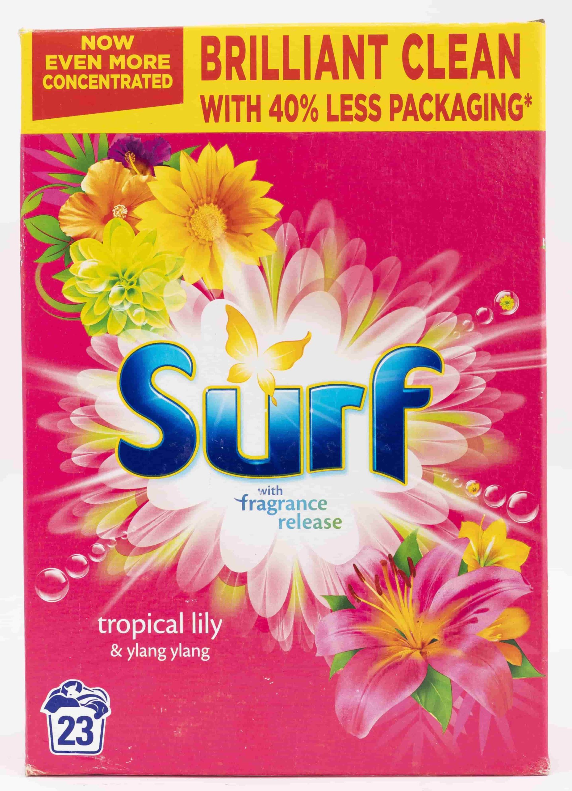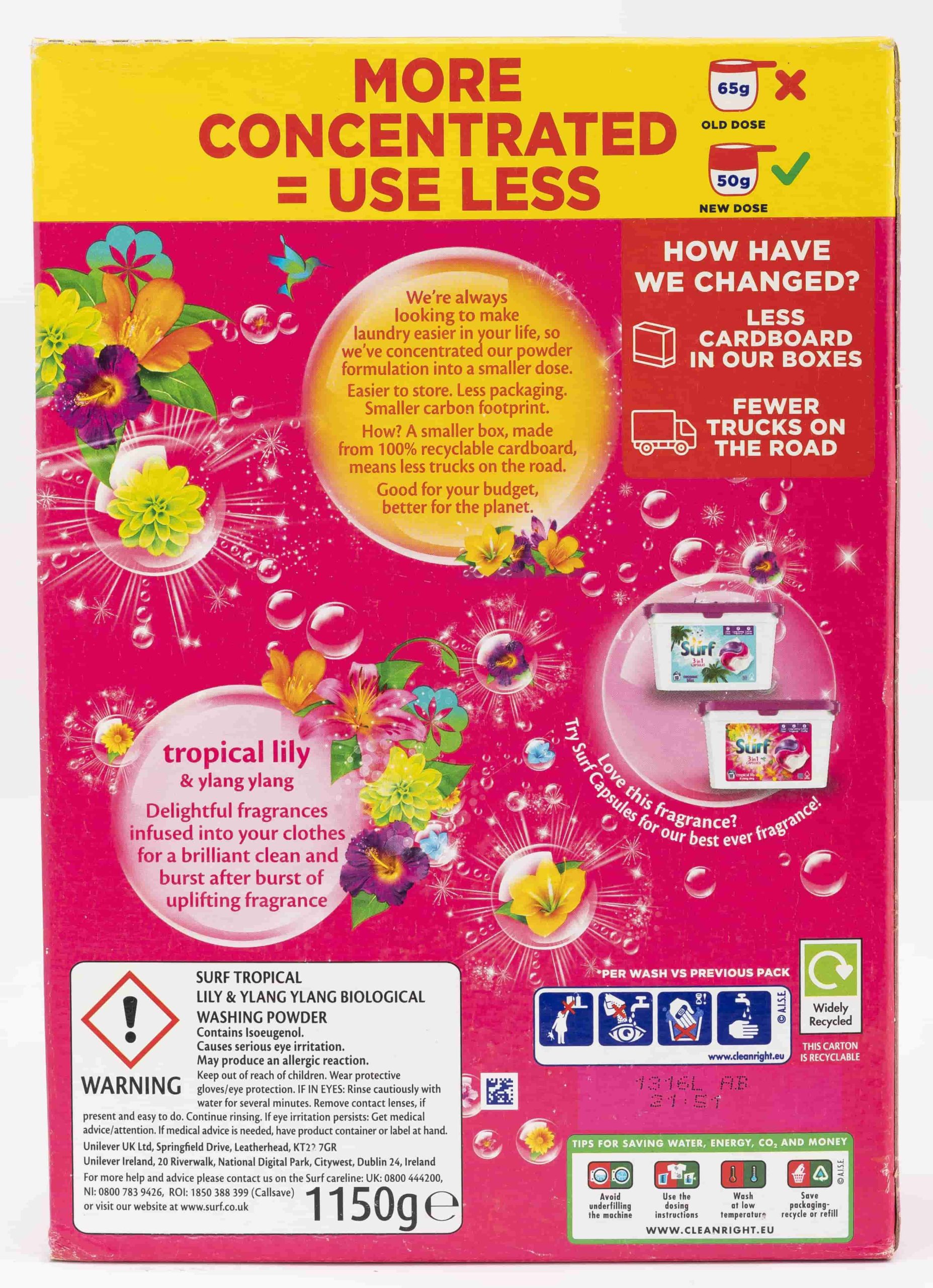 Indulge your senses in fragrant bursts of exotic florals, natural wood and lush fruits with Surf Tropical Lily Laundry Powder. Its fragrance release formula ensures burst after burst of its tropical scent is released right through your day, so your laundry stays fragrantly fresh, with a brilliant deep clean you’ll love. The lily’s honeyed, floral scent is a favourite, ranking in the top five most popular fresh cut flowers in the world. You can rest assured that your clothes will be brilliantly clean and fresh for longer with this laundry detergent from the UK’s no.1 fragrance powder detergent brand**. What’s more, this washing powder now uses 31% less packaging*. A smaller box, made from 100% recyclable cardboard. Good for your budget, better for the planet. Surf Tropical Lily Laundry Powder with its sensational fragrance is available in washing liquid, washing powder and washing capsules. Its unique formula cares for the fabric in your clothes, and it is suitable for washing both colours and whites. Surf’s laundry range offers brilliant cleaning while bringing you the joy of fresh fragrance long after you’ve washed your clothes. For best results, measure 50 g of powder into a cup and then into the drawer of your machine. Don’t add this powder to the washing machine drum, and don’t mix it into a paste with water to pre-treat stains. *vs previous packaging **Kantar 52 w/e 08.02.2022