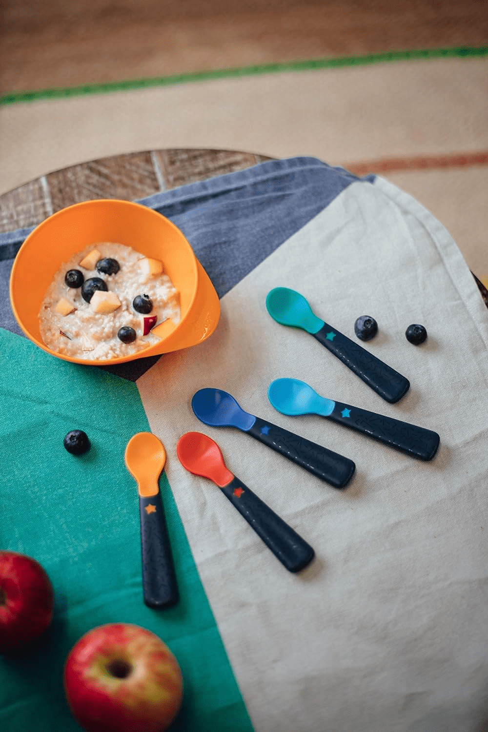 If your baby wants to eat alone, this is an important development step. That’s why our learning spoons have a non-slip design so that they lie well in the baby’s hand and get as much porridge as possible from the plate to the spoon and into the mouth.