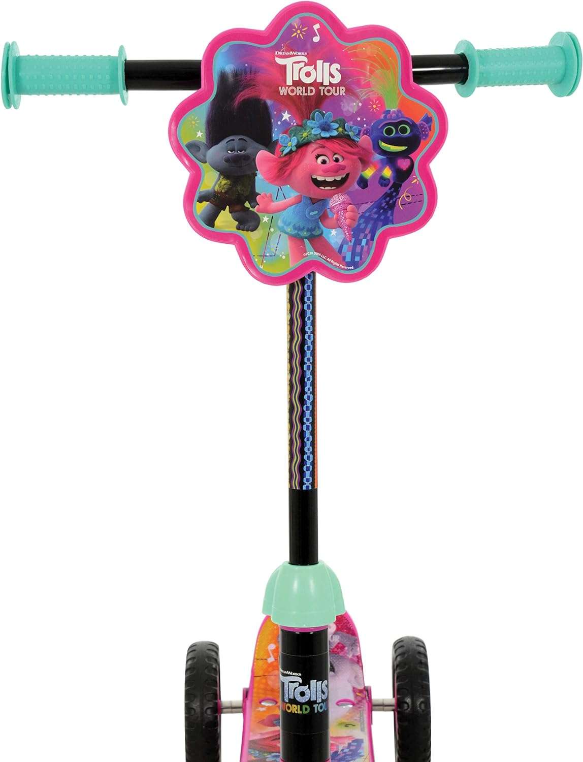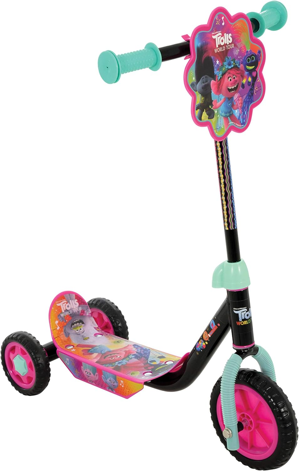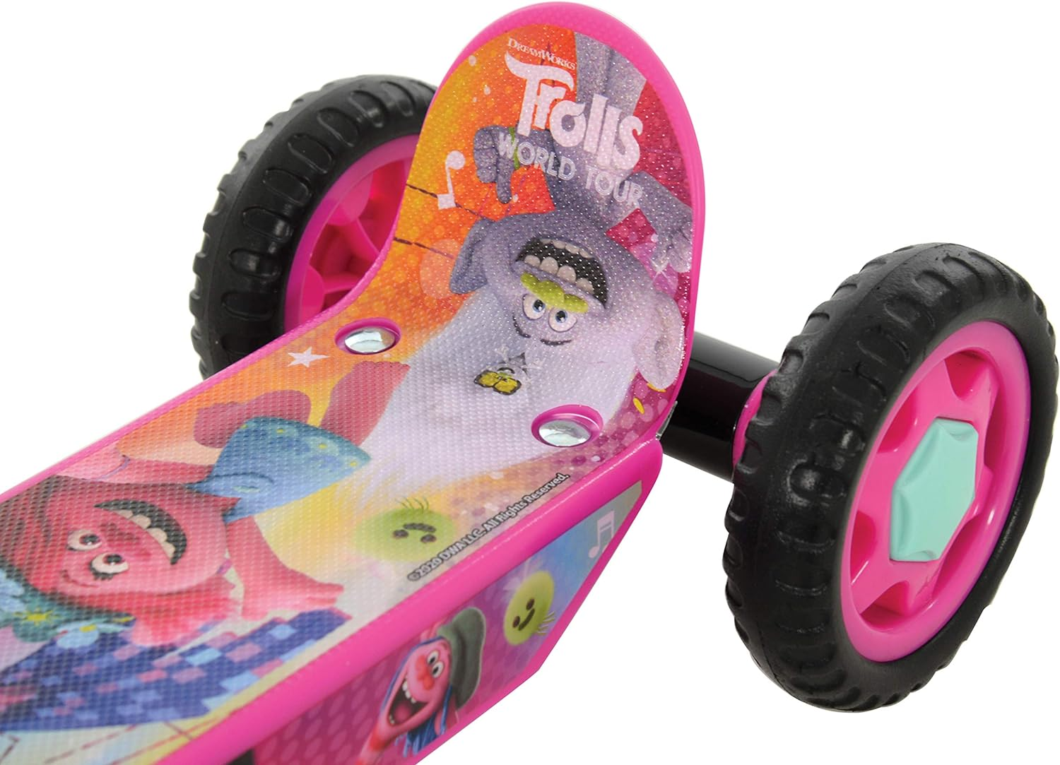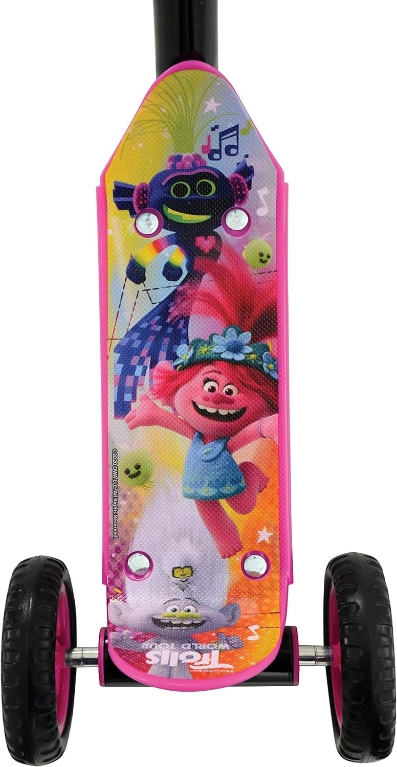 An ideal first scooter for any little Trolls fan, The Deluxe tri-scooter boasts an array of features. The fully printed anti-slip foot plate not only ensures safety but features Anna and Elsa. The wheels are all constructed from wide puncture proof tyres with deep tread ensuring Both optimal grip but stability for riders getting the hand of scooting. For additional safety and Durability, The forks are protected and the rear axles are covered to prevent injury. The handlebar adjusts in height as riders grow and sports a beautiful custom shapes character plaque. Suitable for riders up to 20kg