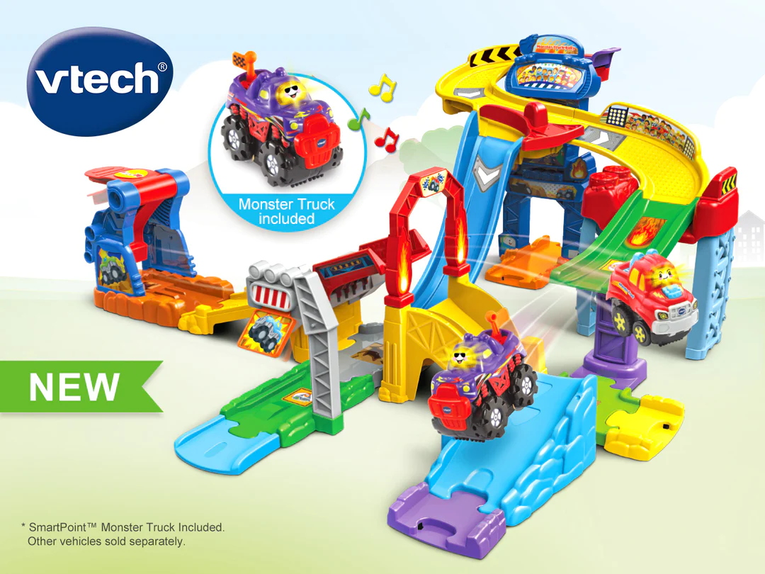 Jump, Race and launch your Toot-Toot cars around the Toot-Toot Drivers Monster Truck Rally by VTech! Play set includes a cute Toot-Toot Drivers Monster Truck featuring 3 sing-along songs, 6 melodies and 4 interactive Smart Point locations that trigger fun responses when driven over. Press down on the launcher to see the Monster Truck jump over a bridge and through a fire hoop! Launch it down the high stunt tower ramp to see it jump over a deep precipice! Move the gates to change the track direction and switch to a different configuration of the play set to create different stunt tracks.