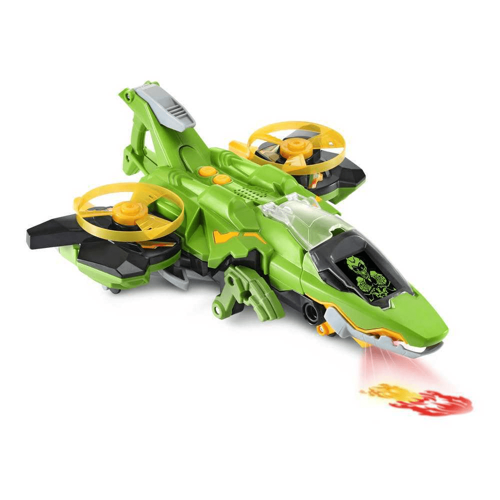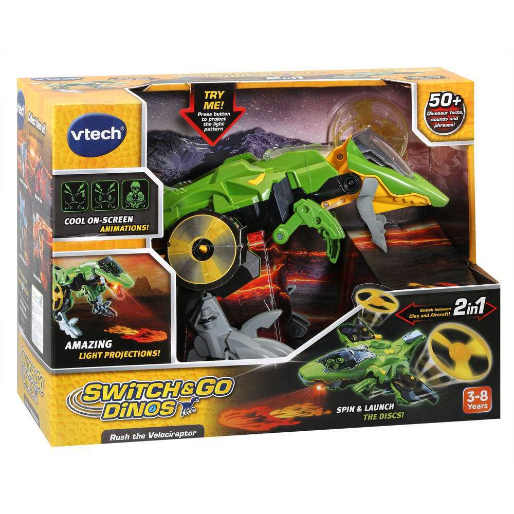 Introducing Rush the Velociraptor by VTech! This wild Switch & Go Dino is an exciting 2-in-1 toy which switches between a Velociraptor and a high tech aircraft! See cool dino eye and pilot animations on the backlit LCD screen! Pull the wing triggers in aircraft mode to see the spinning discs launch into the air! Press the light projection button to see Rush shine their light! Press the voice button to hear exciting car and dinosaur sound effects, phrases and Velociraptor facts! Rush will light up with the responses. Hear even more great sound effects when switching Rush between dinosaur and aircraft modes!